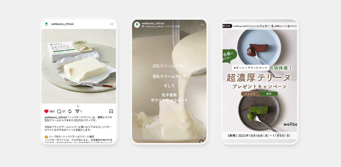 プラントベースフードブランド「wellbeans」。ブランド創成期からSNS運用施策を中心に、ユーザーの声や反応を収集・分析。データや気付きを活かした広告施策、商品開発、販促イベント企画等の多岐にわたりプロジェクトチームメンバーとして取り組み、“継続的なデータ分析”と“最適化”でブランド戦略をサポートしました。