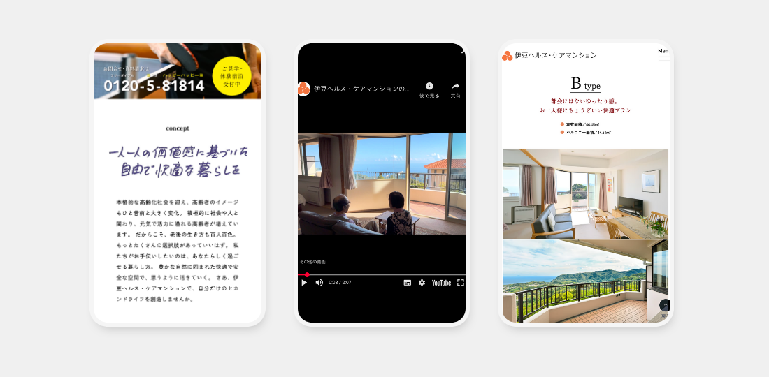 伊豆ヘルス・ケア株式会社様が運営する介護・温泉付きシルバーマンション「伊豆ヘルス・ケアマンション」のサイトリニューアルプロジェクト。弊社はコーディング及びCMS実装を担当しました。